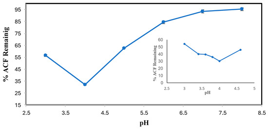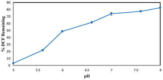 The effect of pH on the conversion of DCF after 3 h of enzymatic treatment is shown in Figure 2. Subsequent experiments were analyzed by HPLC over a narrower pH range of 3.0–8.0 and at an SBP activity of 0.15 U/mL, with 0.40 mM hydrogen peroxide. Figure 2 indicates that the most effective pH for DCF enzymatic conversion is 5.0, which showed 4% remaining with 0.15 U/mL SBP. Above this pH value, the enzymatic activity decreased drastically, causing a reduced efficiency in catalytic conversion. However, DCF precipitated in reaction mixtures below pH 5.0 and in the no-SBP control. This could be due to the pKa of DCF, 4.18, [19], the protonated carboxyl form being much less soluble than the carboxylate. Therefore, at pH values < 5.0, enzymatic reactions of DCF could not be conducted because DCF predominantly exists in its neutral form, exhibiting lower solubility and precipitating under these conditions [20,21]. For example, at pH 5.0 100% of 0.10 mM DCF was soluble, whereas at pH 3.0, only 22% of the compound remained in the buffered reaction solution. Hence, pH 5.0 was chosen as the most effective for DCF. This choice is further supported by the pH behavior of ACF, shown below, for which precipitation did not occur at pH values < 5.0.