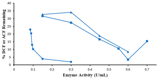 Enzyme activity optimization. (0.1 mM DCF, pH 5.0, 0.40 mM H2O2, ●; 0.1 mM ACF, pH 4.0, 0.40 mM H2O2, ▲; 0.10 mM ACF, pH 4.0, 0.45 mM H2O2 ■; 3 h reaction, room temperature). Reactions conducted in triplicate; error bars that are not visible are smaller than the symbols.