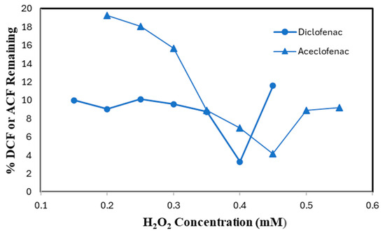 SBP-catalyzed conversion of DCF and ACF was conducted to optimize H2O2 concentration at the pre-determined most effective pH values and minimum effective SBP activities. For 0.10 mM DCF and ACF, the best performance was observed at 0.40 mM of H2O2 with a minimum of 3.4% of substrate remaining and 0.45 mM H2O2 concentration (4.2% remaining), respectively, as shown in Figure 5. Increasing the concentration of H2O2 over 0.40 mM for DCF and 0.45 mM for ACF, resulted in a lower removal efficiency. This might be due to inactivation of SBP through the formation of compound III (reversibly catalytically inactive) in the presence of excess H2O2, or conversion to the irreversibly inactive derivative P-670 [16].