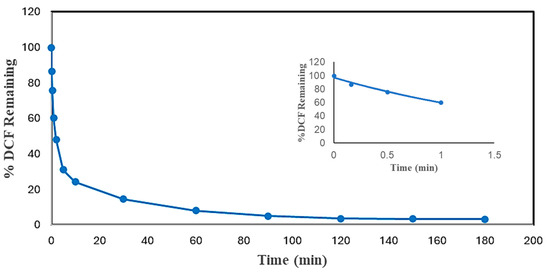 Time dependence of conversion of DCF in optimal conditions batch reactor. (0.10 mM DCF, pH 5.0, 0.40 mM H2O2, 0.15 U/mL SBP, 3 h reaction, room temperature). Inset shows first-order fit of the first 4 data points: % DCF Remaining = 96.946e−0.484t, R2 = 0.9777.