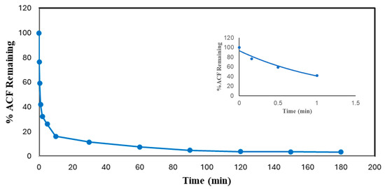 Time dependence of conversion of ACF in optimal conditions batch reactor. (0.1 mM ACF, pH 4.0, 0.45 mM H2O2, 0.60 U/mL SBP, 3 h reaction, room temperature). Inset shows first-order fit of the first 4 data points: % ACF Remaining = 93.02e−0.823t, R2 = 0.9591.