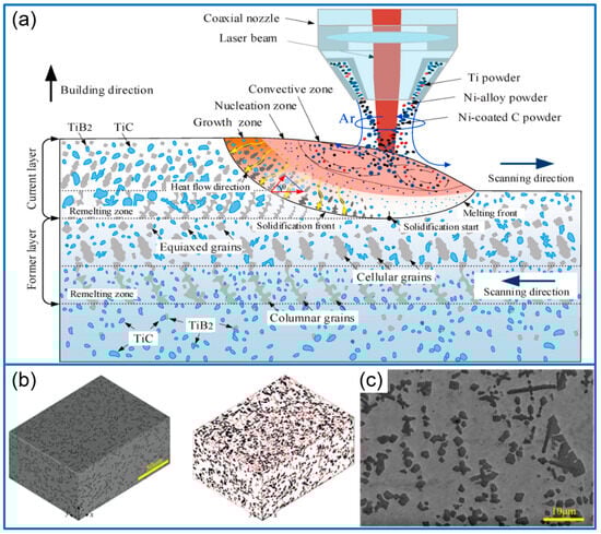 Morphologies of the sample of CoNi-50Ti2AlC (a) and CoNI-50Ti3AlC2 (b) [74]; Copyright (2024) Elsevier. The reaction process of Ti2AlC in the melting pool (c) [75]. Copyright (2024) Elsevier.