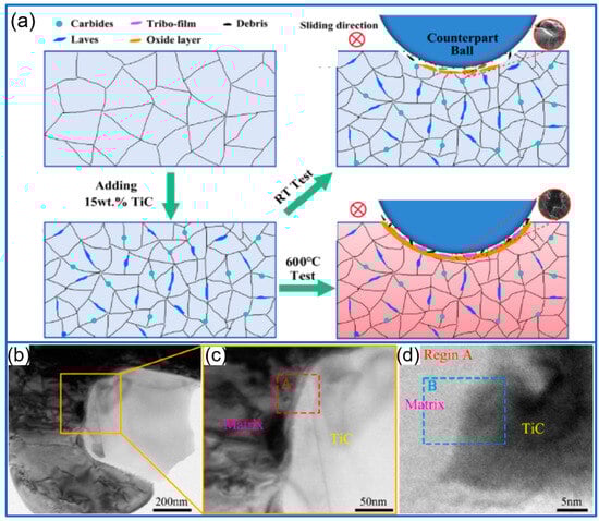 Microstructure evolution for TiC-free coating and 15 wt% TiC coating, and the wear behaviors at different temperatures (a) [50]; Copyright (2024) Elsevier. TEM images of TiC and HEA matrix (b), and corresponding magnified region (c,d) [52]. Copyright (2024) Elsevier.
