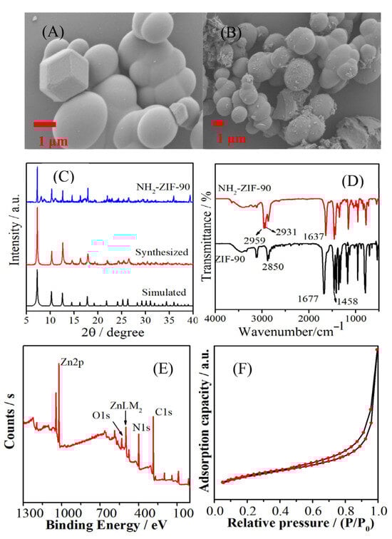 SEM images of (A) ZIF-90, (B) NH2-ZIF-90. (C) XRD patterns of simulated ZIF-90, synthesized ZIF-90, and NH2-ZIF-90. (D) FT-IR spectra of ZIF-90 and NH2-ZIF-90. (E) XPS survey spectrum. (F) N2 adsorption–desorption isotherm of NH2-ZIF-90.