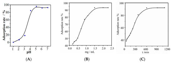 Effect of (A) pH, (B) the addition amount, and (C) adsorption time on the adsorption of Au(III) by NH2-ZIF-90.
