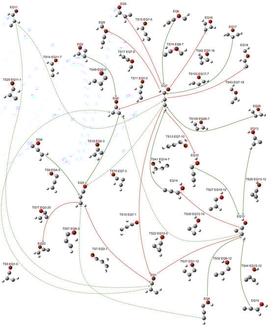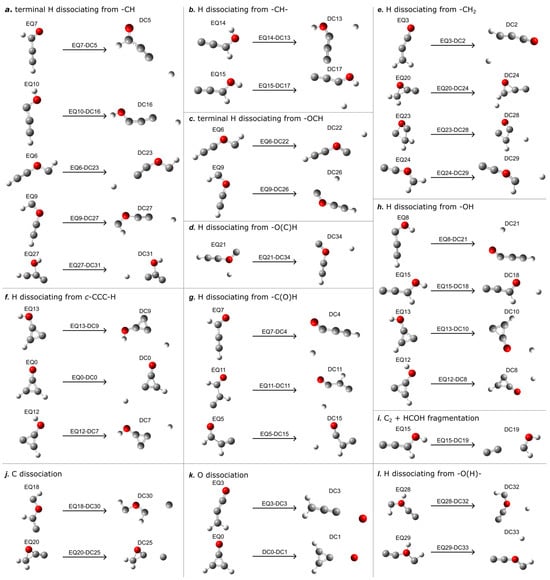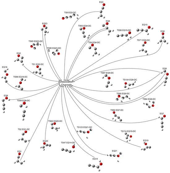 TS-mediated dissociation channels represented as EQa-TSb-DC pathways. Atoms colored red represent oxygen, gray represent carbon, and white represent hydrogen.