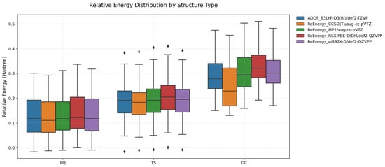 Comparative analysis of multiple computational methods indicates the high accuracy for the current exploration method, B3LYP-D3(BJ)/def2-TZVP. The comparisons are presented in Figure 4, where box plots depict relative energy distributions across structural types and computational methods. In these plots, the rectangular box represents the interquartile range (Q1–Q3), with the internal horizontal line indicating the median. Whiskers extend to data points within 1.5 × IQR from the quartiles, while diamond-shaped markers denote statistical outliers exceeding this threshold, which are primarily observed in TSs, where electronic configuration complexity introduces greater method sensitivity.
