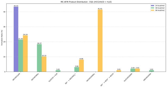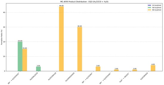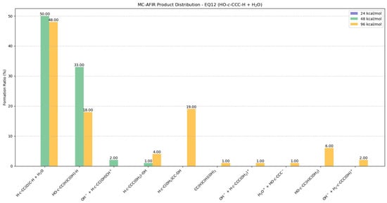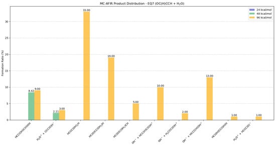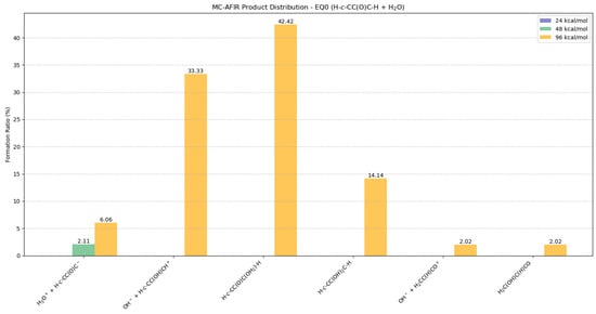The EQ12 isomer demonstrated diminished ionic species formation while preferentially isomerizing to EQ0 in the presence of a single water molecule (Figure 9 and Supplementary Materials, Table S7). At 24 kcal/mol, no reactions were observed in the MC-AFIR calculations. The distributions revealed high selectivity for EQ0 (H-c-CC(O)C-H) + H2O formation, yielding 50% and 48% values at collision energies of 48 kcal/mol and 96 kcal/mol, respectively. BOMD simulations indicate that the subsequent reaction was unfavorable, as illustrated in Figure S20.