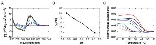 Tm values for thermal melting upon heating were determined through the nonlinear fitting of the melting curve (absorbance vs. temperature) to a theoretical melting curve or through the first-derivative analysis for low-temperature melting [39]. Errors in Tm values were typically smaller than 0.5 °C, and thus, the theoretical statistical uncertainty in the difference between two Tm values is smaller than 0.7 °C. Thermodynamic parameters (∆G°, ∆H°, and ∆S°) for i-motif formation were determined through the nonlinear fitting of the melting curve to the van’t Hoff equation assuming a two-state melting transition [39,40], and values are reported as averages with standard deviations of four independent measurements.