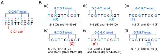 Here, we study the variability in the i-motif-forming DNA sequence comprising two TCGTTCCGT sequence units, which forms two C:C+ pairs and two G:C:G:T tetrads. The base tetrad is formed through hydrogen-bonded G:G pairing at the minor groove of G residues, with each G also engaging in base pairing with either C (G:C pairing) or T (G:T pairing). The reference oligonucleotide TCGTTCCGTAAATCGTTCCGT (mini-iM) adopts a monomeric i-motif structure, where the C residues at positions 2, 7, 14, and 19 (numbered from the 5′ end) form a C:C+ pair and the nucleotides at positions 1, 3, 6, 8, 13, 15, 18, and 20 participate in a G:C:G:T tetrad (Scheme 2A). According to the reported nuclear magnetic resonance (NMR) structure in solution [24], these nucleotides engage in base stacking interactions (Scheme 1B), where the overlapping area between the G:C:G:T tetrad and the adjacent C:C+ pair is relatively large while the overlap between C:C+ pairs is relatively small. The base overlap also occurs between the G:C:G:T tetrad and the first T of each loop at positions 4, 9, and 16 or the 3′-terminal T at position 21.
