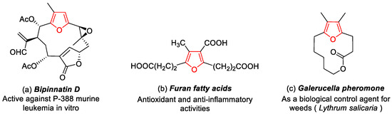 Polysubstituted furan rings are prevalent in numerous natural products [1] and pharmaceutical molecules [2]; some key examples of furan-containing structures are shown in Figure 1 [3,4,5]. Furthermore, the furan ring motif serves as a valuable structural scaffold, playing a crucial role in diverse fields such as polymeric materials [6], organic functional materials [7], and synthetic chemistry [8]. Consequently, polysubstituted furans, particularly tetrasubstituted furan compounds, have garnered increasing attention from the scientific community [9], leading to the development of dedicated methodologies for the synthesis of functionalized tetrasubstituted furan compounds [10,11].