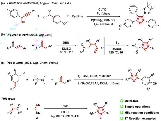 Generally, the furan scaffold can be constructed via metal catalysis [12], non-metal catalysis [13,14], photocatalysis [15], and electrocatalysis [16]. Among these methods, the cyclization of carbonyl compounds and enynols using transition metal catalysis to afford the desired furan products is relatively common [17]. For instance, Fürstner’s group [18] recently reported the synthesis of tetrasubstituted furans (Scheme 1a) using propargylic alcohols, bis(pinacolato)diboron (B2(pin)2), and acyl chlorides as starting materials. The reaction, catalyzed by a palladium/copper metal catalytic system with potassium bis(trimethylsilyl)amide (KHMDS) as the base and P(OPh)3 as the ligand, proceeds through a series of steps including the borylation of propargylic alcohol and acyl chloride, regioselective acylation, cyclization and dehydration, and Suzuki coupling.