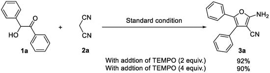 Thus, the optimized reaction conditions were established as follows: using benzoin 1a (0.3 mmol) and malononitrile 2a (0.6 mmol) as substrates, cesium fluoride (0.9 mmol) as the base, anhydrous ethanol (5 mL) as the solvent, under an N2 atmosphere, and refluxing at 80 °C for 4 h. Under these conditions, the yield can reach a maximum of 94% (Entry 31).