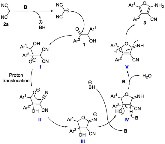 Initially, malononitrile 2a, under the influence of cesium fluoride (Base, denoted as B), undergoes deprotonation to generate a carbanion [40]. This carbanion subsequently attacks the carbonyl carbon of benzoin 1, affording intermediate I. Then, intermediate I undergoes a proton shift, yielding intermediate II. The oxygen anion of II intramolecularly attacks the adjacent cyano carbon [41], resulting in the formation of cyclic intermediate III. Intermediate III undergoes a proton transfer to form intermediate IV, which further undergoes intramolecular dehydration [42], giving the imine intermediate V. Finally, intermediate V undergoes keto-enol tautomerization [43], yielding the final product 3.