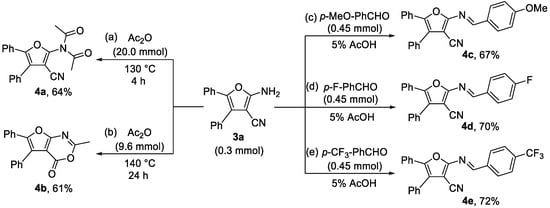 At the same time, an aldimine condensation reaction by using the amino group in compound 3a with p-methoxybenzaldehyde, p-fluorobenzaldehyde, and p-trifluoro- methylbenzaldehyde, respectively, can also be smoothly performed, yielding the corresponding furan Schiff base derivatives 4c, 4d, and 4e in moderate yields (Scheme 5).