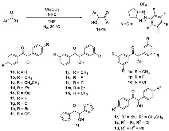 According to Scheme 6 and as the reported method [50], the mixture of aryl aldehyde (2 mmol), NHC (0.5% mmol), Cs2CO3 (0.5% mmol), and THF (100 μL) was stirred under a N2 atmosphere for 0.5–12 h as monitored by thin-layer chromatography (TLC). The reaction was quenched when the mixture became a white slurry. The sample was diluted with CH2Cl2 (10 mL) after quenching with the saturated NH4Cl and washed with the saturated NaCl (5 mL), followed by extraction with CH2Cl2 (3 × 5 mL). The organic phase was then dried over anhydrous Na2SO4.