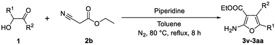 According to Scheme 8, the mixture of α-hydroxy ketones 1 (0.3 mmol), ethyl cyanoacetate 2b (0.6 mmol), piperidine (0.9 mmol), and toluene (3 mL) was stirred under protection by nitrogen at 80 °C for 8 h. After cooling to room temperature, the sample was diluted with EA (10 mL), washed with the saturated NaCl solution (5 mL), and extracted with EA (3 × 5 mL).