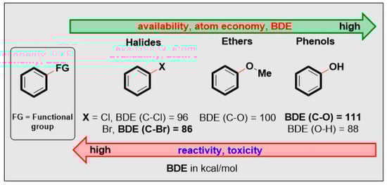 Comparison of BDE of CAr–FG bond in haloarenes, ethers, and phenols.