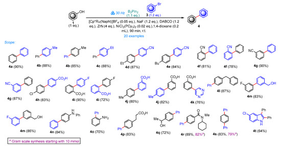 In a glovebox under a constant purge of argon, a 5 mL grinding vessel (made of stainless steel) equipped with three balls (made of stainless steel, diameter: 5 mm) was loaded consecutively with phenol starting material 1 (1 mmol, 1 equiv.), [Cp*Ru(Napht)]BF4 (22.6 mg, 0.05 mmol, 0.05 equiv.), bis(pinacolato)diboron (279 mg, 1.1 mmol, 1.1 equiv.), NaF (50 mg, 1.2 mmol, 1.2 equiv.), DABCO (135 mg, 1.2 mmol, 1.2 equiv.), appropriate aryl bromide 3 (1.2 mmol, 1.2 equiv.), NiCl2(PCy3)2 (14 mg, 0.02 mmol, 0.02 equiv.), and ZrN (421 mg, 4 mmol, 4 equiv.). Finaly, 1,4-dioxane (0.2 mL) was added. The reaction vessel was properly capped, installed on the mill, and subjected to milling at 30 Hz for 90 min at room temperature. The vessel was opened, and the contents were generously treated with distilled water, filtrated, and properly dried in vacuum. The resulting crude product was directly subjected to gradient flash chromatography on silica gel using n-hexane and an ethyl acetate system as an eluent to isolate the desired product 4.