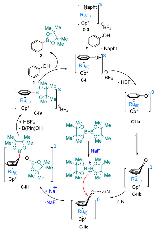 Following the available literature, the most plausible mechanism for the deoxygenative borylation of phenol is presented in Scheme 4. The initial arene exchange of the naphthalene by phenol 1 in the C-0 complex to yield C-I is well established in the literature [54]. The deprotonation of the Ru-coordinated phenol in C-I (in presence of BF4−) leads to the formation of a neutral complex C-IIa, which exists in resonance with the η5-phenoxo complex C-IIb. Further, C-IIb is stabilized by the interaction with the solid adsorbent [59], in our case, the highly oxophilic ZrN [60] which, under mechanical conditions, induces LMCT to Ru(II), formally reducing it to Ru(I) to form intermediate C-IIc, having a phenoxyl radical ligand. The radical character of species C-IIc provided a lower activation energy barrier (considering C-IIc against C-IIb) for the next step, i.e., for the nucleophilic attack of the anionic form of pinacolborane onto the carbonyl group, leading to the formation of C-III, which, in turn, liberated pinacolborane ester BPinOH upon interaction with HBF4. This protonation step induced the electron density to drop and return Ru(I) to the Ru(II) state. The resulting cationic η6-(trifluoromethyl)arene complex C-IV entered an aryl exchange step with phenolic starting material 1, liberating product 2 and regenerating the active complex C-I for another turnover. To confirm the involvement of the radical species in the proposed mechanism, a radical trapping experiment was conducted by performing the model reaction with the additional presence (3 equiv.) of 2,2,6,6-tetramethyl-1-piperidinyloxy (TEMPO). Expectedly, the reaction failed, confirming the proposed radical nature of the reaction.