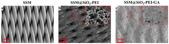 SEM images: (a) SSM; (b) SSM@SiO2-PEI; (c) SSM@SiO2-PEI-GA.