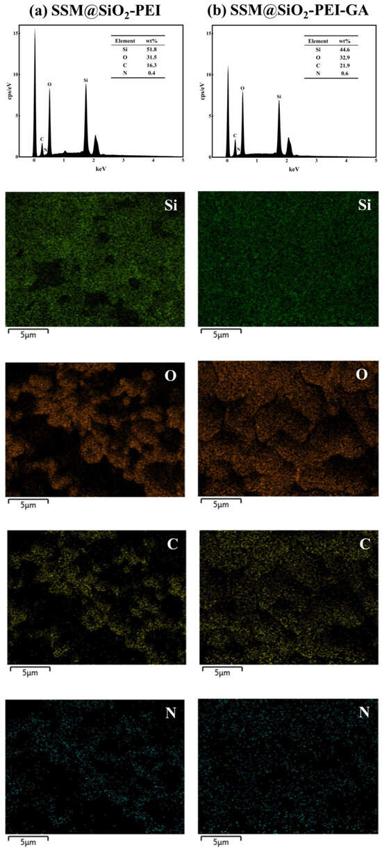 The EDS results and mapping: (a) SSM@SiO2-PEI; (b) SSM@SiO2-PEI-GA.