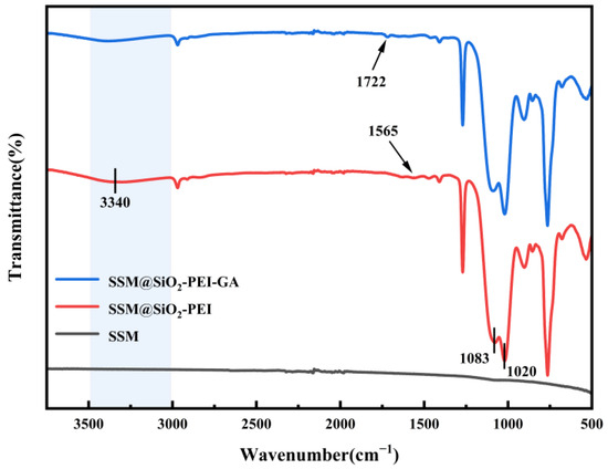 The chemical structure of SSM@SiO2-PEI and SSM@SiO2-PEI-GA was identified using Fourier-transform infrared spectroscopy (FT-IR); the FT-IR spectra are shown in Figure 4. Peaks at 1083 cm−1 and 1020 cm−1 were caused by the stretching vibrations of Si-O-Si bonds [36], indicating that TMOM underwent hydrolytic condensation to form SiO2. The band at 1565 cm−1 is attributed to the N-H bending vibrations of primary amines in PEI [37]; this peak was relatively weak due to the low concentration of PEI in the sample. The broadband observed near 3340 cm−1 resulted from the overlapping stretching vibrations of N–H and O–H bonds [31,37,38,39]. In the spectrum of SSM@SiO2-PEI-GA, a characteristic peak at 1722 cm−1 appeared, corresponding to the stretching vibrations of C=O groups in GA [31,40,41]. Additionally, the N-H bending vibration peak of primary amines weakened after grafting GA, further confirming the reaction between primary amines and aldehyde groups. The FT-IR results indicate that SiO2-PEI and GA have been successfully grafted onto the SSM.