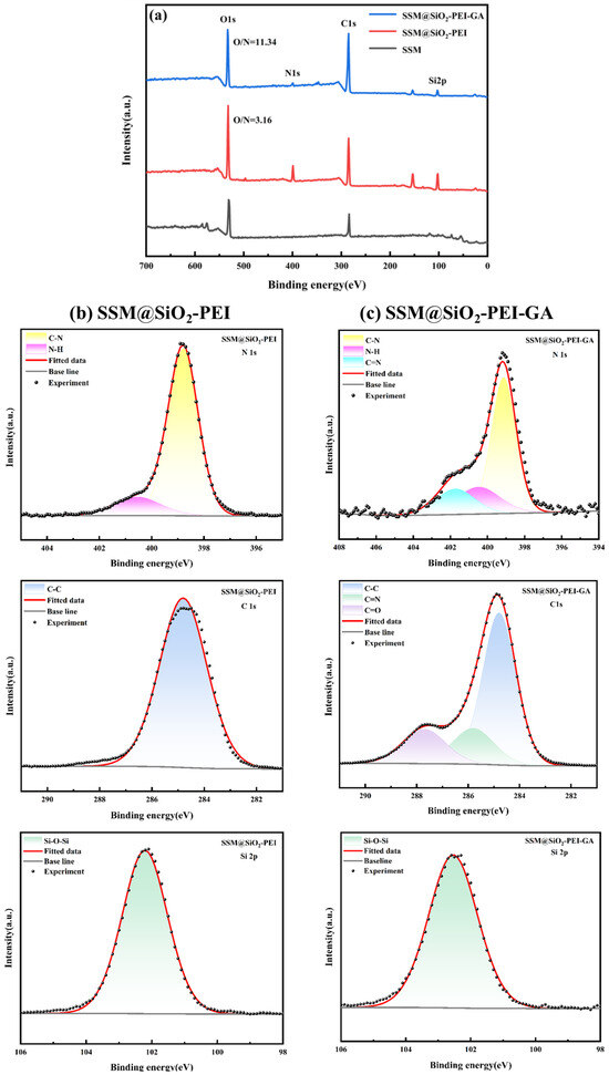 (a) XPS survey spectra of SSM, SSM@SiO2-PEI, and SSM@SiO2-PEI-GA; (b) high-resolution XPS N 1s, C 1s, and Si 2p spectra of SSM@SiO2-PEI; and (c) high-resolution XPS N 1s, C 1s, and Si 2p spectra of SSM@SiO2-PEI-GA.