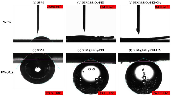 The water contact angles: (a) SSM; (b) SSM@SiO2-PEI; (c) SSM@SiO2-PEI-GA. The underwater oil contact angles: (d) SSM; (e) SSM@SiO2-PEI; (f) SSM@SiO2-PEI-GA.