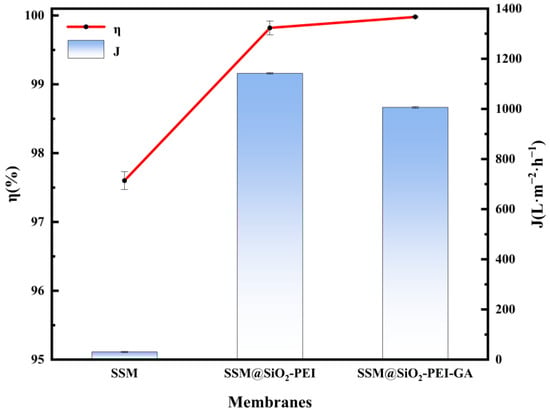 Separation efficiency and flux of SSM, SSM@SiO2-PEI, and SSM@SiO2-PEI-GA.