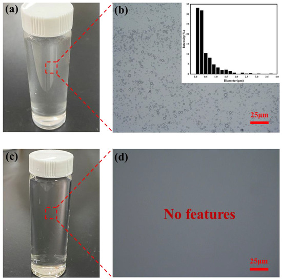 Before separation, the pump oil emulsion appeared milky white (Figure 8a), and widely distributed oil droplets were observed under an optical microscope; the particle size distribution showed that most oil droplets had a diameter of less than 1 µm (Figure 8b). After separation using the SSM@SiO2-PEI-GA, the filtrate became transparent (Figure 8c), with almost no detectable oil droplets remaining (Figure 8d). The excellent efficiency of modified membrane in separating pump oil emulsion is further confirmed by this result.