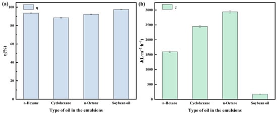 To evaluate the separation performance of the SSM@SiO2-PEI-GA, four different oil-in-water emulsions were prepared using n-hexane, cyclohexane, n-octane, and soybean oil (Figure 9). The membrane exhibited separation efficiencies of 93.5%, 88.5%, 92.3%, and 97.5% for these emulsions, with corresponding fluxes of 1596.6, 2448.2, 2938.0, and 174.9 L·m−2·h−1, respectively. Notably, the flux for the soybean oil emulsion was significantly lower than the others. The fouling mechanism of soybean oil on the modified membrane can be attributed to three interrelated factors. First, the triglyceride-dominated composition of soybean oil contains polar functional groups (e.g., ester and carboxylic acid groups) which have a stronger affinity for the amine groups on PEI compared to non-polar mineral oil. This polarity-driven interaction promotes the adsorption of oil droplets onto the modified layer. Secondly, the long-chain triglyceride structure increases the viscosity of the oil, which increases the hydrodynamic resistance and causes oil droplets to accumulate on the membrane surface. This accumulation gradually forms an adherent oil layer that blocks the membrane pores, reducing the effective filtration area and causing a rapid drop in flow. Third, the rough micro–nanostructured surface of the membrane facilitates the physical capture of oil droplets by anchoring polar groups in surface grooves. In addition, the inherent adhesion of soybean oil accelerates irreversible pore blockage, synergistically exacerbating the fouling process [52,53]. These results demonstrate the versatility of the SSM@SiO2-PEI-GA in separating a wide range of oil–water emulsions, while highlighting the challenges associated with high-viscosity oils.