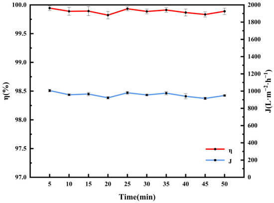 To assess the operational stability of the SSM@SiO2-PEI-GA, 10 consecutive separation cycles were performed using a high-viscosity pump oil emulsion (Figure 10). The membrane demonstrated exceptional durability, maintaining over 99.8% separation efficiency throughout all cycles without significant flux loss. Remarkably, surface regeneration was achieved using only 100 mL of ultrapure water for backwashing between cycles, effectively removing residual oil contaminants. This outstanding antifouling performance is due to the robust crosslinked GA-PEI network, which maintains the underwater superoleophobic microstructure of the membrane during repeated use. The combination of structural integrity and ease of regeneration greatly enhances the reusability of the membrane. This feature is a critical advantage for industrial oil–water separation applications, where operational longevity and maintenance costs are paramount.