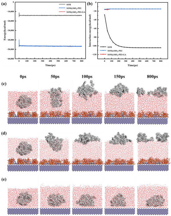 (a) The total energy of different models at different times. (b) The calculated of different models at different times. (c) Snapshots of the oil/water-SSM@SiO2-PEI-GA model at different times. (d) Snapshots of the oil/water-SSM@SiO2-PEI model at different times. (e) Snapshots of the oil/water-SSM model at different times.