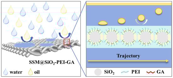 To address these limitations, this study optimized the preparation of oil–water emulsion separation membranes by synergistically regulating surface micro-roughness and chemical modification [34,35]. A stainless steel mesh (SSM) with high mechanical strength was selected as the substrate material. SiO2 coated with polyethyleneimine (PEI) was used to create a specific rough structure while providing excellent oleophobic performance. Additionally, glutaraldehyde (GA) was employed to enhance the grafting strength of the modified layer through chemical crosslinking, resulting in a superhydrophilic and underwater superoleophobic membrane that achieves high performance and durability under ambient pressure. The membrane’s antifouling capability, broad applicability, and reusability were demonstrated through tests of wettability, separation efficiency across various oil–water emulsion systems, and cycling experiments. Furthermore, molecular dynamics (MD) simulations were conducted to investigate the influence of the modified layer on the motion trajectories of oil molecules in oil-in-water emulsions. By calculating the interaction energy between oil and the interface, the mechanisms behind the enhanced oleophobic performance were elucidated, providing a theoretical foundation for future research.