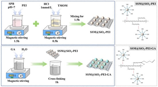 The SSM was cut into circles with a diameter of 5 cm and subjected to ultrasonic cleaning in acetone, ethanol, and ultrapure water for 15 min each. Afterward, the SSM was dried at 60 °C for 8 h to obtain pretreated SSM. Sodium phosphate buffer (SPB) with a pH of 7 was prepared by thoroughly mixing Na2HPO4 and NaH2PO4 in water. PEI was added to the SPB and magnetically stirred for 1.5 h to produce a PEI-SPB solution with a PEI concentration of 0.2 wt%. At the same time, TMOM was added to a 1 mmol/L HCl solution to prepare a TMOM-HCl solution with a concentration of 1 mol/L, and the SSM was soaked in this solution for 0.5 h. The PEI-SPB solution and the TMOM-HCl solution were then mixed in a volume ratio of 185:15 and stirred magnetically for 1.5 h. The mixture was allowed to stand at room temperature for 12 h to ensure sufficient loading of the generated SiO2-PEI particles onto the SSM membrane. Finally, a 0.2 mol/L GA aqueous solution was prepared and preheated to 50 °C. The SSM@SiO2-PEI was immersed in the GA solution at 50 °C for 1 h. The SSM@SiO2-PEI-GA was prepared using the aforementioned steps. The detailed preparation process for SSM@SiO2-PEI-GA is illustrated in Figure 13.