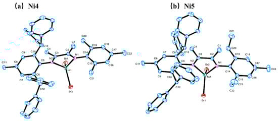 X-ray-quality crystals of Ni4 and Ni5 were grown via controlled diffusion of diethyl ether into their saturated dichloromethane solutions of the complexes (Figure 1a,b). Both complexes adopt a distorted tetrahedral geometry with a four-coordinate nickel center, as evidenced by bond angles and lengths deviating from ideal tetrahedral symmetry. Notably, the N-bound phenyl rings—one substituted with sterically demanding dibenzhydryl groups and the other with an alkyl group—display significant tilting relative to the coordination plane [C(2)–C(3)–N(2)–Ni(1)–N(1)]. The dihedral angles in Ni4 (87.3° and 79.6°) and Ni5 (89.9° and 85.9°) highlight the steric influence of ortho-dibenzhydryl groups. Intriguingly, Ni5 exhibits angles approaching 90°, suggesting enhanced axial site protection compared to literature-reported symmetrical analogues [52], a feature critical for suppressing catalyst deactivation. Furthermore, the N1–Ni1–N2 and Br1–Ni1–Br2 bond angles in these complexes are slightly smaller than those observed in our previously reported unsymmetrical bis(imino)acenaphthene nickel complexes [53]. As summarized in Table 1, the Ni–N2 bond lengths are slightly longer than the Ni–N1 bond lengths in both Ni4 and Ni5, attributed to steric repulsion from the benzhydryl groups weakening Nimine coordination to the nickel center—a trend consistent with our previous findings [52].