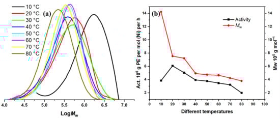 (a) GPC traces and (b) plots of catalytic activity and molecular weight of the polyethylene produced using Ni1/Et2AlCl at different run temperatures (entries 4 and 6–12, Table 3).