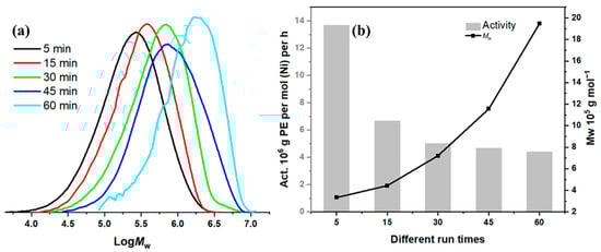(a) GPC traces and (b) plots of catalytic activity and molecular weight of the polyethylene produced using Ni1/Et2AlCl at different run times (entries 4 and 13–16, Table 3).