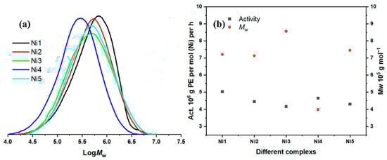 Following optimization of Ni1/Et2AlCl, a systematic evaluation of structural analogs (Ni2–Ni5) was conducted under identical polymerization conditions (Al/Ni = 600, 20 °C, 10 atm ethylene) to elucidate ligand structure-performance correlations (entries 7, 19–22, Table 3). All catalysts demonstrated high activities (4.16–6.07 × 106 g PE mol−1 (Ni) h−1) while producing polyethylenes with high molecular weights (3.98–8.56 × 105 g mol−1) and narrow dispersities (Mw/Mn = 2.29–2.50) (Figure 5a). The ligand architectures uniformly incorporated a sterically demanding N-2,6-dibenzhydryl-4-methylphenyl group, while systematically varying substituents on the secondary N-aryl moiety. A distinct structure-activity correlation emerged with the activity decreasing in the following order: Ni1 [2,6-di(Me)] > Ni4 [2,4,6-tri(Me)] > Ni2 [2,6-di(Et)] > Ni5 [2,6-di(Et)-4-Me] > Ni3 [2,6-di(i-Pr)]. This progression highlights the steric modulation—less hindered analogs (Ni1 and Ni4) exhibited 21% and 8% greater catalytic activity than their bulkier counterparts (Ni2 and Ni5, respectively). The axial alkyl substituents’ steric bulk impedes ethylene coordination and insertion at the active center through spatial occupation of the metal coordination sphere [33]. The most sterically encumbered Ni3 accordingly exhibited the lowest activities.
