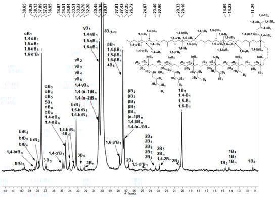 The melt temperatures of polyethylene are dependent on the reaction conditions and vary significantly with an increase in reaction temperature (entries 4, 6–12, Table 3). Polyethylene produced at 10 °C had a high melt temperature of 88.99 °C, while that produced at 50 °C showed a much lower melt temperature of 15.47 °C. Above 50 °C, no distinct melt temperature was observed, as the polymer transitioned from 35.78% crystallinity at 10 °C to only 8.19% at 50 °C, ultimately becoming fully amorphous above 50 °C. This change in crystallinity is directly related to the branching degree and content [55]. To investigate the branching content of the polyethylenes, high-temperature 13C NMR spectroscopy was employed for polyethylene produced at different temperatures. In particular, two polyethylene samples prepared using Ni1/Et2AlCl at 20 °C and 70 °C (entries 7 and 11, Table 3), labeled as PE-Et2AlCl-20 and PE-Et2AlCl-70, were characterized (Figure 6 and Figure 7). The signals were assigned based on previous reports [56]. PE-Et2AlCl-20 contained 84 branches/1000 carbons (Table 4), with the predominant types being methyl (84.8%), ethyl (3.1%), propyl (4.0%), butyl (4.9%), amyl (0.8%), and longer chains (2.4%). In comparison, PE-Et2AlCl-70 (entry 11, Table 3) exhibited an extremely high level of branching (217 branches per 1000 carbons). The main types of branches were methyl (71.4%), ethyl (5.3%), propyl (6.1%), butyl (8.8%), amyl (2.0%), and longer chains (6.4%). This occurs due to the enhanced chain walking reactions that are more prominent at higher temperatures. At elevated temperatures, the energy barriers for the formation of β-agostic alkyl metal complexes decrease, leading to more frequent chain walking events. Consequently, the polyethylene produced under these conditions exhibits an increased branching degree, which results in a lower melt temperature [37,43]. Compared to previously reported precatalysts B (Scheme 1), the replacement of para-Cl with a para-Me group in the prepared nickel complexes increased both the branching degree (B: 102 branches/1000C, this work: 217 branches/1000C) and the molecular weight of the polyethylenes [52].