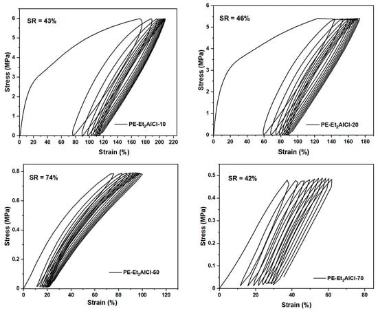 Stress–strain recovery tests for PE-Et2AlCl-10, PE-Et2AlCl-20, PE-Et2AlCl-50, and PE-Et2AlCl-70 at 30 °C.