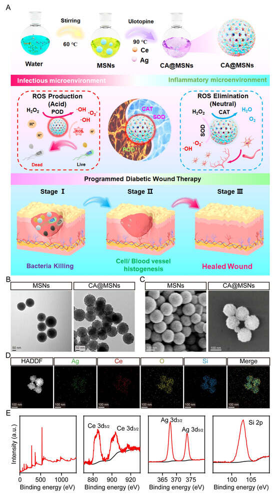 Cerium (Ce) is a therapeutic ion with unique pharmacological properties, including antibacterial and anti-inflammatory effects [13]. It exists in two oxidation states, namely Ce4+ and Ce3+. In acidic conditions (pH 4-5), typical of bacterial infections, Ce4+ acts as a prooxidant, generating ROS to combat pathogens [14,15,16,17]. In physiological conditions (pH 7.4), characteristic of the wound-healing phase, Ce3+ functions as an antioxidant, scavenging excess ROS to mitigate oxidative stress [14,15,16,17]. The catalytic efficiency of Ce is further influenced by doped metal elements, which regulate the ratio of Ce4+ to Ce3+, thereby enhancing its catalytic performance [18]. Building upon this concept, we developed a microenvironment-responsive Ce-Ag-doped mesoporous silica nanomaterial (CA@MSNs) for MRSA-infected diabetic wound treatment. Silver (Ag), a well-known antibacterial ion [19], was incorporated to enhance the ROS-scavenging capability of Ce in physiological conditions. Mesoporous silicon nanomaterials (MSNs) were employed as a substrate due to their high surface area and thermal stability, facilitating nanoparticle stabilization, preventing agglomeration, and promoting dispersion [20]. The resulting CA@MSNs exhibited dual functionality—they generated ROS in infectious microenvironments for bacterial sterilization while scavenging ROS in wound-healing microenvironments to reduce inflammation and oxidative stress. As a result, CA@MSNs not only eliminated MRSA but also promoted endothelial cell proliferation under oxidative stress conditions, thereby significantly accelerating MRSA-infected diabetic wound healing. In summary, this study highlights CA@MSNs as a promising therapeutic agent for diabetic wound healing, offering a smart, adaptive approach to combating MDR infections while promoting tissue regeneration.