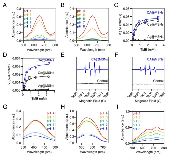 pH-Switchable ROS-generating and scavenging activity of CA@MSNs. (A) POD-like activity and (B) OXD-like activity of CA@MSNs under different pH conditions. Michaelis–Menten kinetic analysis for CA@MSNs in (C) POD-like activity and (D) OXD-like activity. ESR spectra of DMPO/•OH solution in the (E) POD-like activity test and (F) OXD-like activity test, with and without CA@MSNs. (G) CAT-like activity, (H) SOD-like activity, and (I) ABTS radical scavenging tests of CA@MSNs under different pH conditions.