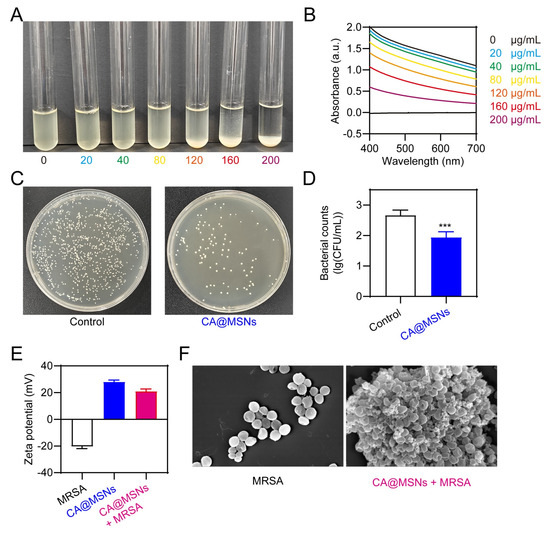 Antibacterial activities of CA@MSNs against MRSA. (A) Photographs and (B) absorbance at 600 nm of MRSA incubated with various concentrations of CA@MSNs. (C) Photographs of agar plates and (D) corresponding bacterial colony counts following CA@MSN treatment, ***, p < 0.001 vs. Control group. (E) The zeta potential profile of CA@MSNs, MRSA, and their mixture in aqueous solutions. (F) SEM images of MRSA treated with or without CA@MSNs.