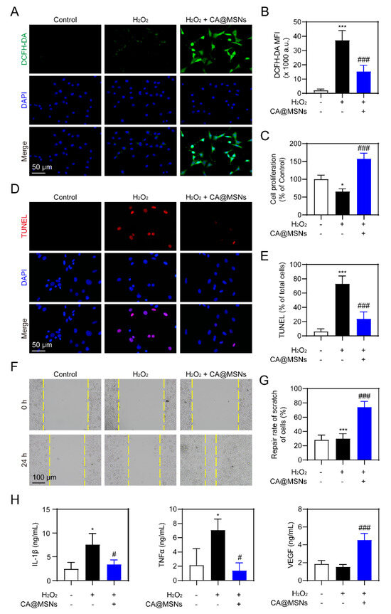 ROS-scavenging and angiogenic activity of CA@MSNs in HUVECs. (A) Representative confocal images and (B) quantification of ROS levels in HUVECs. (C) CCK-8 assay of HUVEC viability with or without CA@MSNs. (D) Representative confocal images and (E) quantification of TUNEL-positive HUVECs. (F,G) Cell migration assay (scratch assay) showing the effect of CA@MSNs. (H) ELISA quantification of IL-1β, TNF-α, and VEGF levels in HUVEC culture supernatants. * p < 0.05, *** p < 0.01 vs. Control group; # p < 0.05, ### p < 0.01 vs. H2O2 + vehicle group.