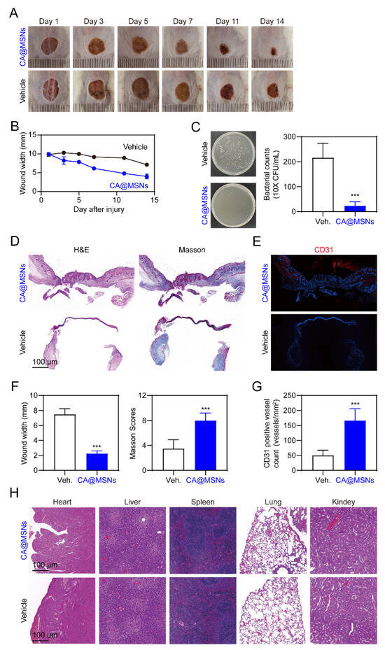 CA@MSNs promote MRSA-infected diabetic wound healing in mice. (A) Representative images showing the change in wound size on different days. (B) The width of the wounds treated with or without CA@MSNs on different days. (C) Representative images showing the number of surviving bacterial colonies on day 14 in the wound area. (D) H&E and Masson’s trichrome staining of the wound tissue on day 14. (E) Representative CD31 immunostaining images showing endothelial cell marker expression on day 14. (F) The width and the Masson score of the wounds treated with or without CA@MSNs on day 14. (G) The number of CD31-positive cells in (E). (H) H&E staining of the heart, liver, spleen, lungs, and kidneys after different treatments on day 14. ***, p < 0.001 vs. vehicle group.
