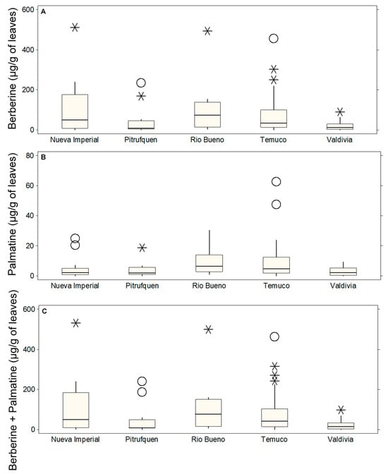 Box plots showing the concentrations of leaves alkaloids (µg/g of DM) in different locations: Nueva Imperial, Pitrufquén, Río Bueno, Temuco, and Valdivia. (A) Berberine, (B) palmatine, and (C) berberine + palmatine. The boxes represent the interquartile range (IQR), the horizontal line within each box indicates the median, whiskers extend to 1.5 times the IQR, and circles denote probable outliers and asterisks denote possible outliers.