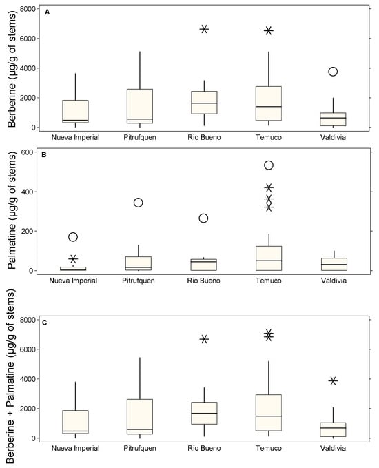Box plots showing the concentrations of stems alkaloids (µg/g of DM) in different locations: Nueva Imperial, Pitrufquén, Río Bueno, Temuco, and Valdivia. (A) Berberine, (B) palmatine, and (C) berberine + palmatine. The boxes represent the interquartile range (IQR), the horizontal line within each box indicates the median, whiskers extend to 1.5 times the IQR, and circles denote probable outliers and asterisks denote possible outliers.