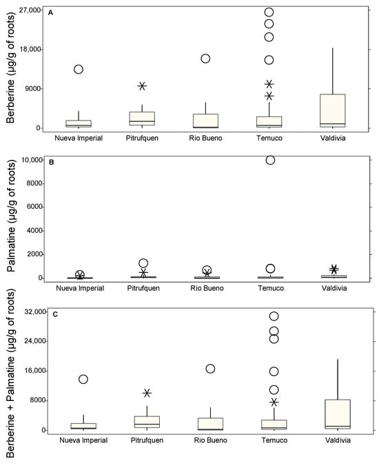Box plots showing the concentrations of roots alkaloids (µg/g of DM) in different locations: Nueva Imperial, Pitrufquén, Río Bueno, Temuco, and Valdivia. (A) Berberine, (B) palmatine, and (C) berberine + palmatine. The boxes represent the interquartile range (IQR), the horizontal line within each box indicates the median, whiskers extend to 1.5 times the IQR, and circles denote probable outliers and asterisks denote possible outliers.